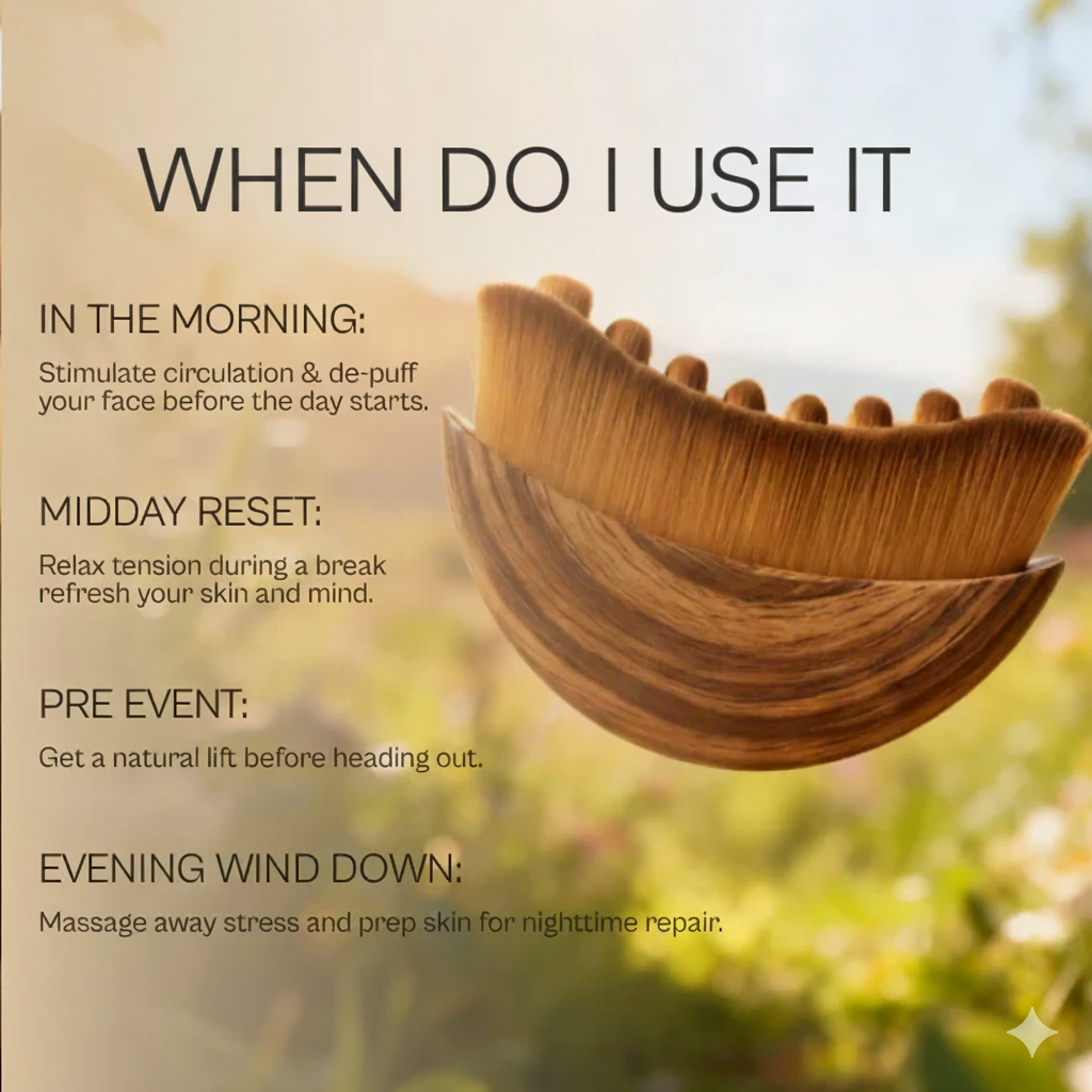 Three major differences: (1) Durability - Our solid wood construction won't crack or shatter like jade rollers. (2) No oils needed - Gua sha requires oils to glide; our brush works on dry skin, eliminating mess and potential breakouts. (3) Ergonomic design - The crescent shape naturally follows your facial contours with precision that flat rollers and stones can't match, making proper technique virtually foolproof.